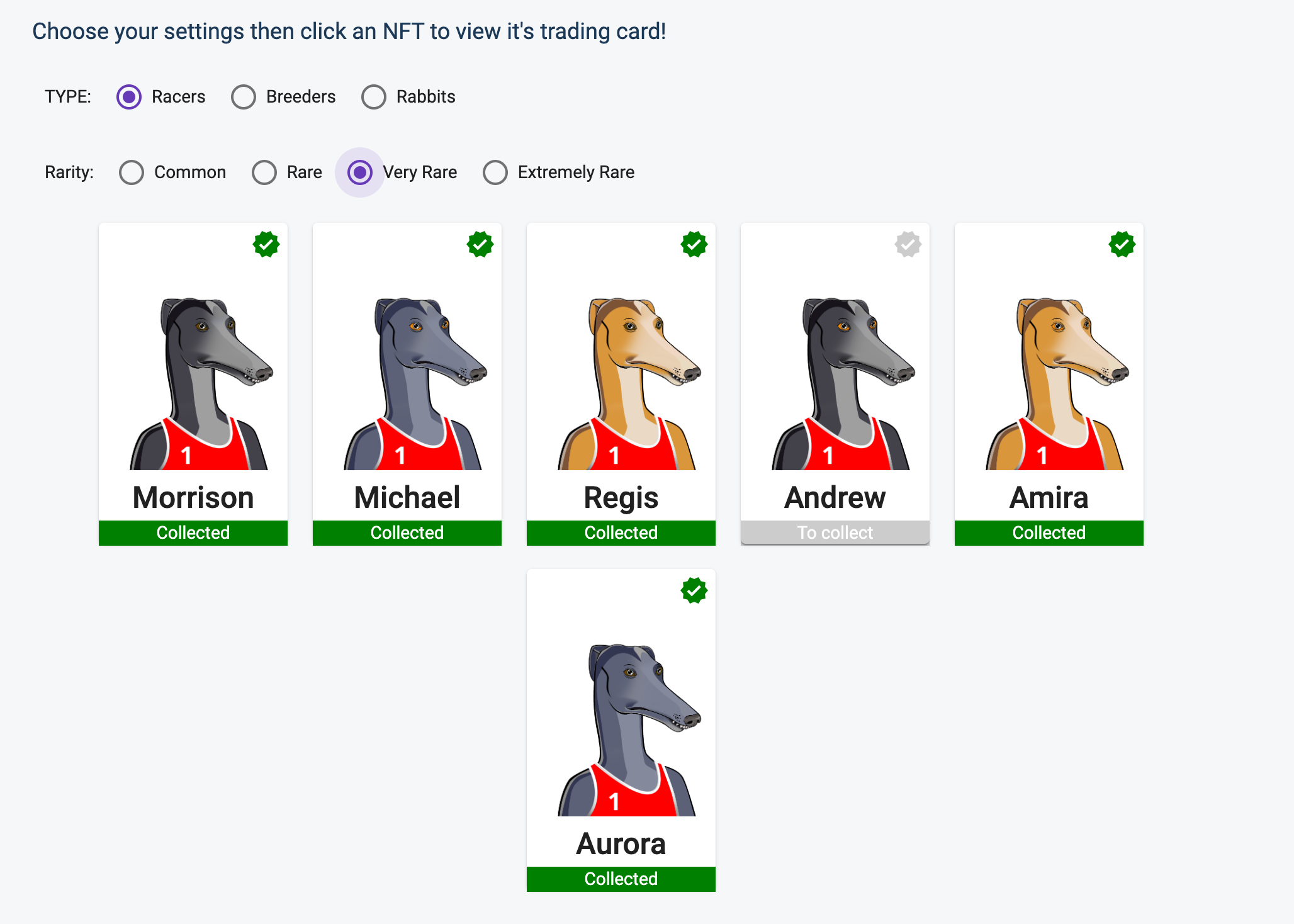 Muzzle Run currently has four collections (Breeder Collection, Racer Collection, Whippet and Rabbit Collection) and each collection contains a subset of subcollections (Common, Rare, Very Rare and Extremely Rare). Muzzle Run incentivises players who manage to own entire collections and subcollections with free tournaments awarding Matic prizes.